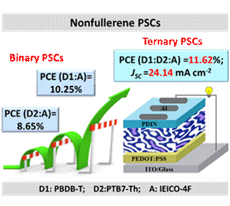 在该工作中,我们以超窄带隙非富勒烯材料IEICO-4F为受体,宽带隙给体材料PBDB-T为给体制备非富勒烯聚合物太阳能电池。中等带隙给体PTB7-Th被选为第三组分,由于PTB7-Th和PBDB-T的HOMO能级非常相似,以及其与主体系互补的吸收光谱。通过掺入20 wt%的PTB7-Th,器件的光电转换效率从10.25%提高到11.62%。最优器件的短路电流提升到24.14 mA cm?2,填充因子提升到65.03%。PTB7-Th的主要贡献可以总结为增强的光子俘获能力以及给体间的能量转移促使的激子利用率的提高。PTB7-Th也可以作为一种调节剂来优化PBDB-T的分子排布以及电荷传输,这有利于填充因子的优化。三元器件的开路电压和二元器件保持一致,这是由于给体材料间相似的HOMO能级。相关工作发表于Adv. Energy Mater., 2018, 8, 1702854。