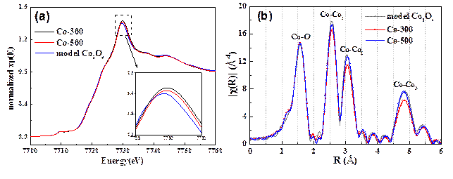 同步辐射X射线吸收测试在对于证明金属缺陷的存在起到了很重要的作用:利用北京同步辐射装置(BSRF)检测了不同温度焙烧样品的Co原子k边吸收谱。通过对XANES的白线峰的对比,发现焙烧温度越低,金属原子的价态越高,说明可能含有更多金属缺陷(图2a)。进一步借助X射线吸收精细结构表征(EXAFS),发现O原子个数基本不变,Co原子个数减少,从而证明了Co缺陷的存在(图2b)。此外,金属缺陷的证明还结合了其它一些表征:元素分析方法(XPS和EDS)证明焙烧样品组成为非化学计量比,Co/O<0.75。正电子湮灭(PALS)测试结果说明,对于Co-300来说,大多数缺陷是点空穴;而焙烧温度的提高不仅减少缺陷含量,且大大增加团簇空穴比例,这跟高能量下原子重排和晶界弛豫有关。