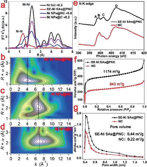 1. a) 镍箔、SE-Ni SAs@PNCNi NPs@NCNi NPs@CFT-EXAFS光谱;b-d) SE-Ni SAs@PNCNi NPs@NCNi NPs@CWT-EXAFS光谱;e) NCSE-Ni SAs@PNCN K NEXAFS光谱;f) NCSE-Ni SAs@PNCN2-脱附等温线;g) NCSE-Ni SAs@PNC相应的孔径分布曲线。