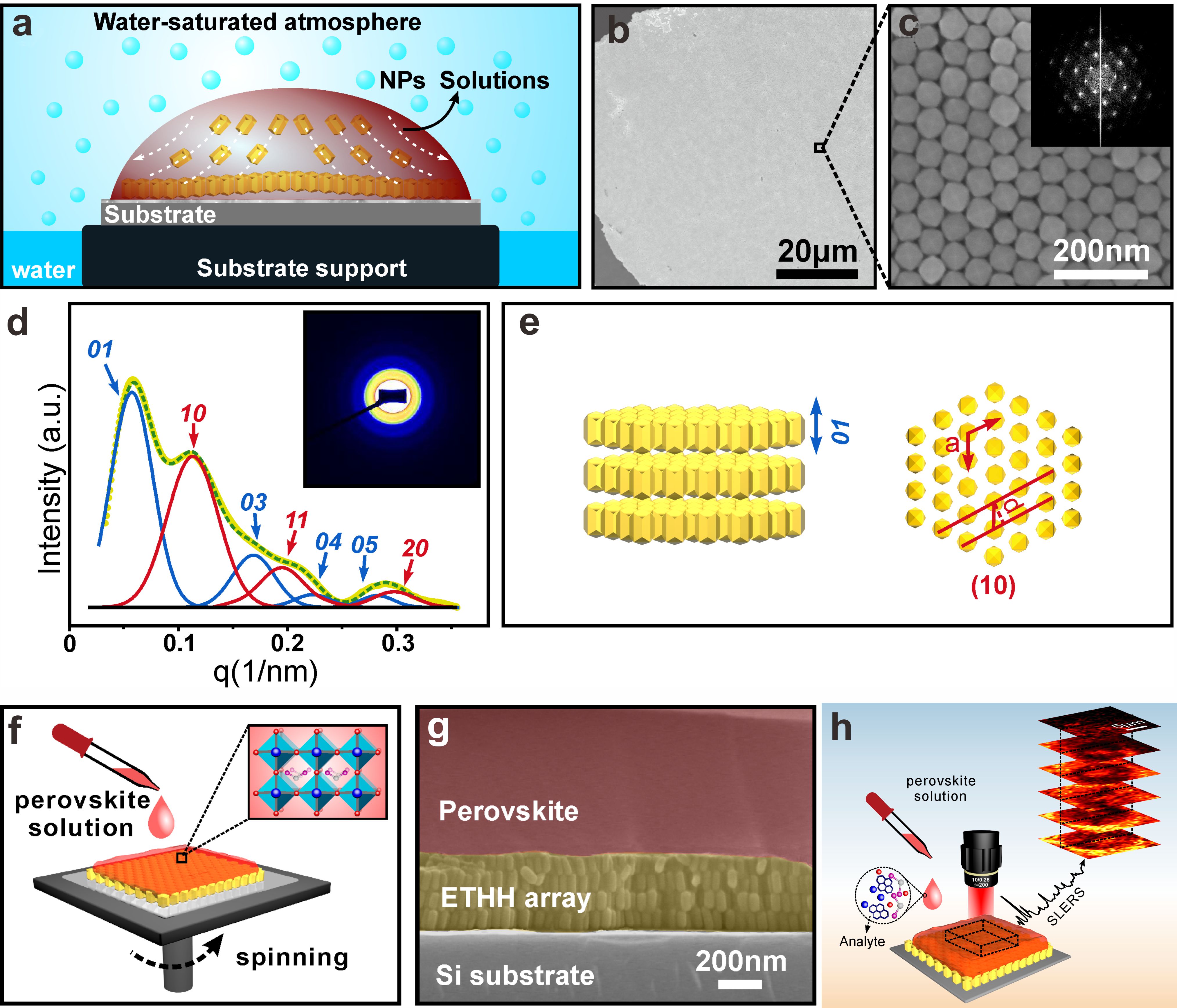 图:金纳米棒组装阵列(a-c),同步辐射小角散射分析(d, e),组装结构上表面介电层制备(f, g)及拉曼散射增强三维效果图(h)。