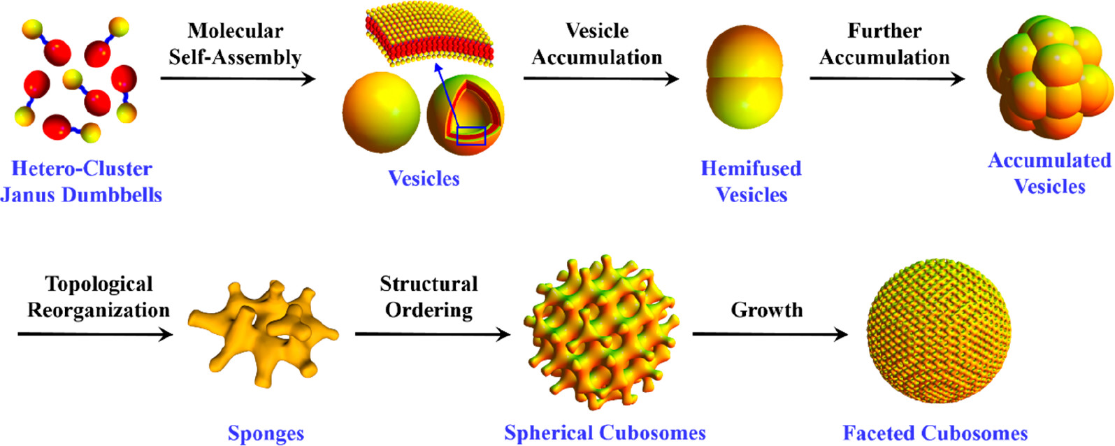 王维研究组独辟蹊径地设计并合成了异质团簇,在溶液中自组装构筑了立方相囊泡,并观察到它们的形成过程,由此阐明了双连续立方相结构形成的机理,揭开了在研究脂质组装中尚未解答的迷。这一基础研究的重要结论是,当立方相囊泡应用在药物缓释的前沿领域时,溶液中的药物首先通过分子组装包裹在囊泡内部,然后通过后续的结构演化后包裹在立方相囊泡中。这个研究的结果将促进立方相囊泡在纳米药物和其它前沿领域中广泛的应用。