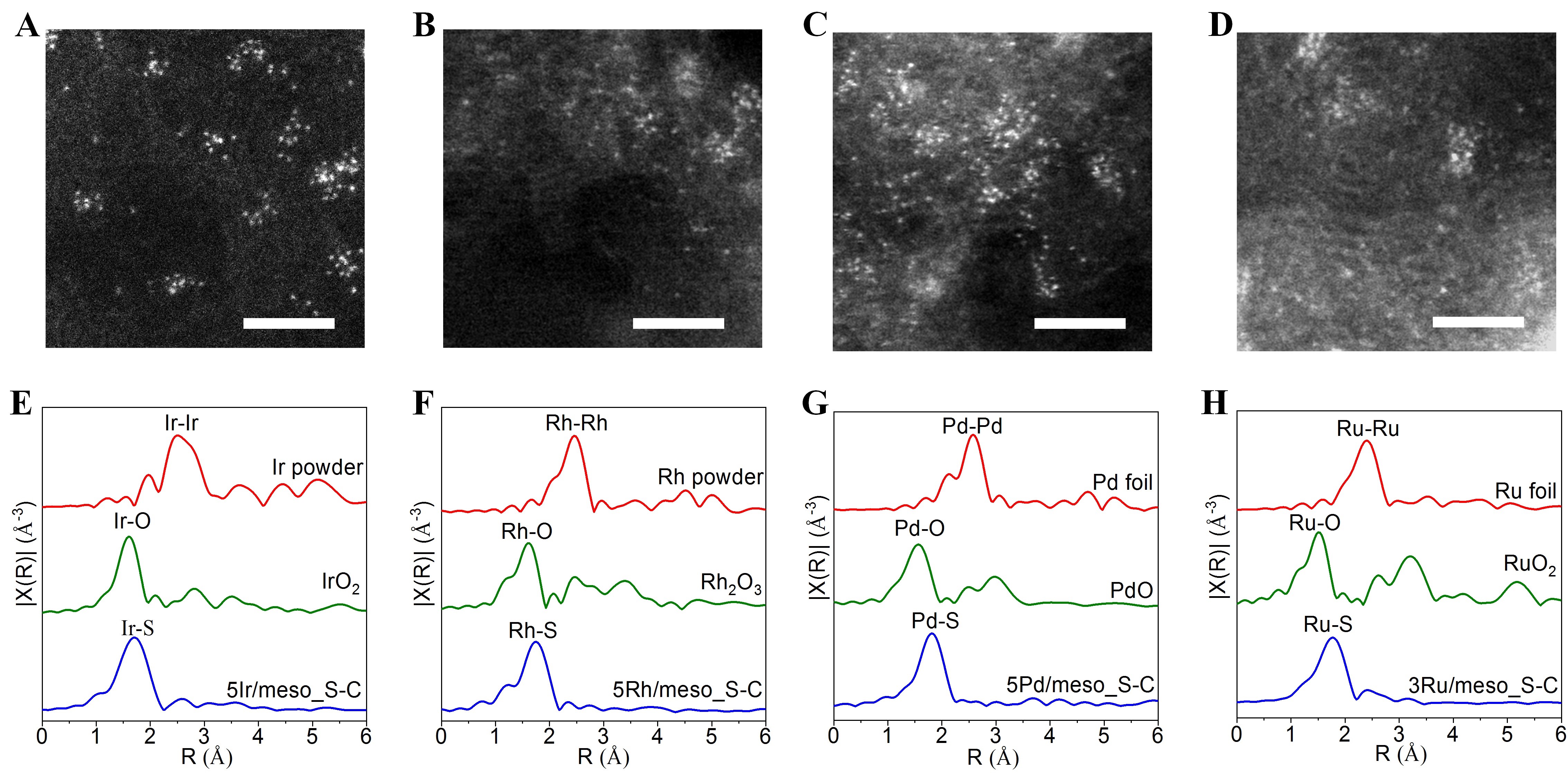 同时在meso_S-C载体上还制备了高载量原子级分散的Ir、Pd、Rh和Ru催化剂,使用球差电镜未发现没有明显的金属原子团聚(图3A-D),使用XAFS进行表征,同样在2.5-2.8埃范围内没有出现金属-金属键的峰,而在大于金属-氧键的位置检测到金属-硫的配位(1.8-2.0埃),表明这些贵金属催化剂以原子形式分散到meso_S-C上。