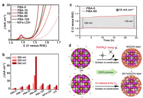 图2. (a)不同催化剂的OER极化曲线;(b)不同催化剂的电流密度对照;(c)PBA-0和PBA-60催化剂的OER稳定性测试;(d)PBA-0和PBA-60催化剂的OER表面重构示意图。