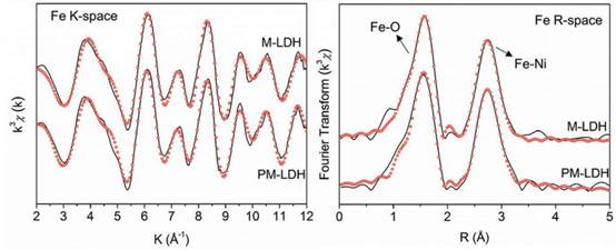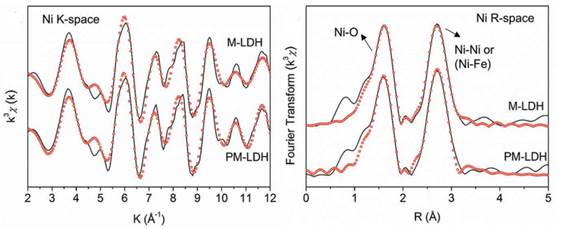 在该工作中,他们通过一种简便的一步法成功地合成了尺寸约30nm,厚度约0.8nm的多孔单层镍铁水滑石(PM-LDH)纳米片。简而言之,在80℃和pH为10的条件下,将含Ni2+和Fe3+的水溶液滴加到甲酰胺水溶液中,仅用10分钟,就可以迅速合成PM-LDH纳米片。通过高分辨透射电镜,电子自旋共振和同步辐射的测试,他们发现这种快速合成的单层镍铁水滑石纳米片中不仅具有大量的孔结构,还含有高浓度的氧和金属离子缺陷。PM-LDH中的氧和金属离子缺陷协同作用不仅可以增加LDH纳米片的导电性,同时还可以增强了水电氧化过程中对H2O吸附和OH*中间体的成键能力,这促使PM-LDH具有优异的电催化产氧性能。PM-LDH在10mAcm-2的电流密度下的过电势是230mV,并且Tafel斜率仅为47mVdec-1。这是迄今为止报道的镍铁水滑石在电催化产氧领域的最佳性能之一。这种制备高效水滑石催化剂简易策略的提出,为多孔单层水滑石纳米片在电催化,催化和太阳能电池中更广泛应用提供了可能。