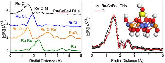 利用北京同步辐射装置(BSRF)1W1B-XAFS实验站的X射线吸收谱分析,作者确认了单原子钌是通过氧桥键与水滑石层板上的钴或铁原子相连,并且经过对数据的拟合确认了单原子钌第一壳层的氧配位数为3.9±0.7,揭开了此种单原子材料结构的神秘面纱。经过吸收边能量的拟合确认了单原子钌的价态为+1.6价,处于特殊的化学状态,有利于电解水析氧活性的表达。作者表示同步辐射对单原子钌状态的确认提供了很大帮助。