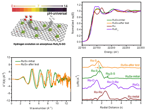 利用北京同步辐射装置(BSRF)1W1B-XAFS实验站的X射线吸收谱分析,作者对此种催化剂在完成电催化析氢反应前后钌的配位情况进行了细致的研究,确定了在催化剂中钌存在类似单原子的状态。初始的硫化钌与石墨烯的复合物中,存在Ru-S和Ru-S-S的配位信号,但是在电催化析氢反应测试以后在此催化剂中只能检测到Ru-S的第一壳层的配位结构,检测不到任何第二壳层的配位情况,没有类似Ru-Ru和Ru-O-Ru的配位,因此可以推测在RuSx中两个Ru之间的距离相对较远,钌作为活性位点时倾向于完成单位点的催化过程。作者表示同步辐射对催化剂中单位点催化机理的确认提供了很大帮助。