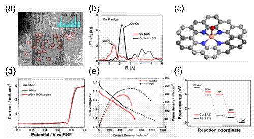 图1 (a) 球差矫正电镜表征的Cu SAC的形貌。(b) Cu SAC及Cu foil的EXAFS表征。(c) Cu SAC吸附氧的理论计算模型。(d)Cu SAC的耐久性测试。(e) 以Cu SAC作为阴极催化剂的阴离子交换膜燃料电池的极化曲线。(f) 密度泛函计算得到的Cu SAC及Pt(111)的ORR反应路径。