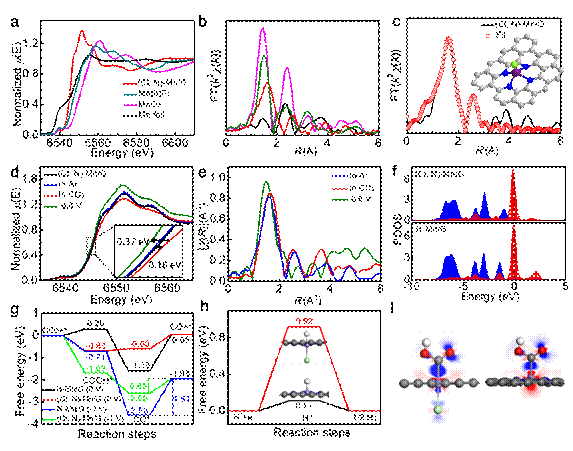 利用北京同步辐射装置(BSRF)1W1B-XAFS实验站开展的X射线吸收谱分析获得活性中心锰的原子配位结构,即锰与一个氯和四个氮原子配位(图1a-c)。进一步通过在电催化过程的原位X-射线吸收谱,结合密度泛函理论计算(图1d-i),揭示了氯元素的配位可以修饰活性锰原子在催化过程中的电子结构,使催化过程的中间体形成的自由能位垒大大降低,从而大大提高了CO2的还原性能。该工作中,同步辐射技术在揭示材料深层次结构和原位跟踪催化反应方面发挥了重要作用。