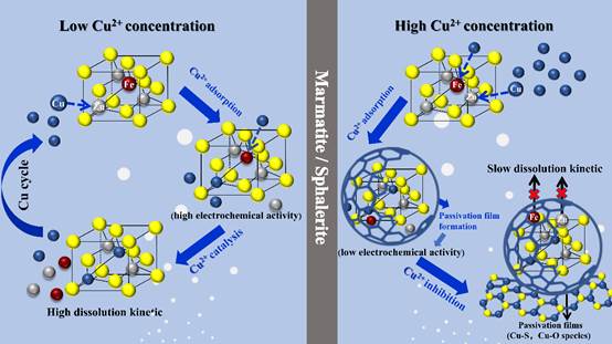 该研究组发现了铜离子在铁闪锌矿氧化溶解中的作用对铜离子的浓度有显著依赖性。在0.25-750 mg/L铜离子浓度范围内,铜离子促进铁闪锌矿的溶解过程,但是当铜离子浓度超过1000 mg/L后,出现了铜离子抑制铁闪锌矿溶解的现象。