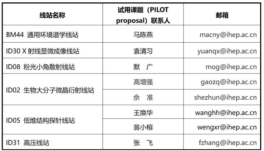 一、HEPS试用课题(PILOT proposal)(申请网址为:https://user.heps.ihep.ac.cn/)是在HEPS光束线站调试期间开展实验的课题类型,目的是尽早提供用户使用并在正式开放前完善线站。第一轮试用的线站为6个(HEPS一期建设共14条用户线站),第一轮试用课题申请截至日期10月31日,试用课题有效期截止时间为2025年12月31日。开放试用课题(PILOT proposal)的首批线站及联系人信息如下,各线站详细介绍请访问HEPS网页(https://heps.ihep.ac.cn/zzjs/gsxz/) 。