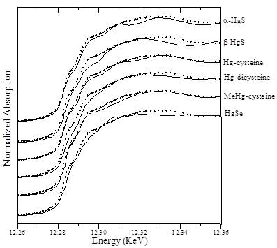图2 米糠和标样中汞的LIII边XANES谱对比(实线为标样XANES谱,虚线为米糠XANES谱)