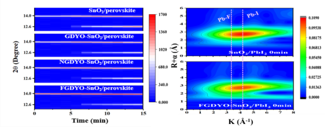 图1 钙钛矿在石墨炔类材料改性的SnO2层上的原位XRD图和PbI2在氟掺杂氧化石墨炔改性的SnO2上的原位吸收谱图