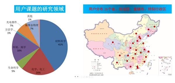 本次开放运行用户课题的研究领域分布示意图(左)及用户分布示意图(右)