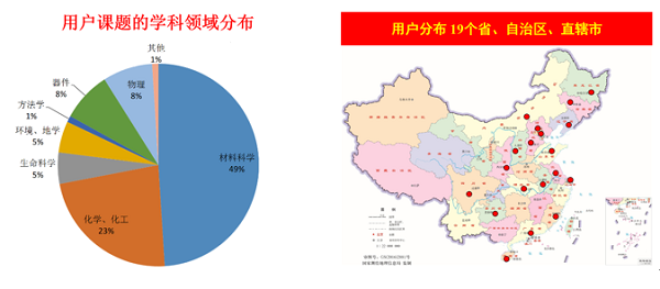 图1 本次开放运行用户课题的学科领域分布示意图(左)及用户分布示意图(右)