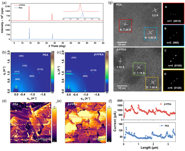 图 基于苯乙胺(PEA)和β-氟苯基乙胺(β-FPEA)的准二维钙钛矿薄膜的X射线衍射谱图,二维-广角掠入射X射线散射谱图,导电原子力显微镜和透射电镜谱图。