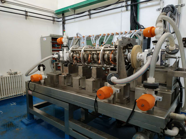 超导腔电抛光设备由溶液配制系统、溶液循环系统、机械运动与旋转密封结构、纯水系统、直流供电单元、排废单元及中央控制系统等多个部分组成。在经过宁夏研制现场安装、机械运行机构调试、透明模型腔带水循环功能调试、9cell超导腔带水机械装置及溶液循环功能联调、中控系统控制联调、1cell及9cell超导腔通酸调试,以及期间相关电抛光工艺探索等一系列工作后,于7月25日利用高能所特制的可拆卸样品腔对该设备进行了测试。