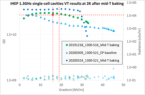 超导腔技术路线所取得的初步成功对于高能所正在攻关、目前国际上也尚不十分稳定的技术路线来说开辟了新的研发之路。其中,采用中温烘烤工艺的1.3 GHz单cell超导腔(编号为PAPS-HTF-1300-S016)在2K垂直测试下加速梯度达到33MV/m,对应Q0约为1.8×1010,而在16MV/m梯度下Q0约为3.0×1010,远高于EP工艺腔典型Q值(约2×1010)。另一只超导腔(编号为PAPS-HNF-1300-S021)在2K垂直测试下加速梯度为25MV/m时Q0大于3.5×1010。
