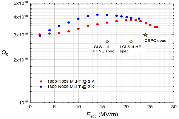 六只9-cell超导腔的性能均超过了上海硬X射线自由电子激光装置(SHINE)及美国直线相干光源二期项目(LCLS-II)的指标(2.7×1010@16 MV/m,加速梯度高于19 MV/m),也超过了美国直线相干光源二期能量升级项目(LCLS-II-HE)的指标(2.7×1010@21 MV/m),从公布的结果上看,Q值平均优于LCLS-II-HE掺氮超导腔。