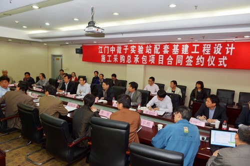4月16日,江门中微子实验站配套基建工程总承包项目合同签约仪式及土建与科研需求讨论会在高能所举行,高能所所长王贻芳、副所长罗小安及项目组成员,江门中微子实验监理清华大学教授邵贝贝,黄河勘测规划设计有限公司副总经理许人、工程院院长牛富敏,中国水利水电第六工程局有限公司水电六局副局长祝郴阳、河南锦源建设有限公司董事长邓文朴等领导和专家出席了本次会议。