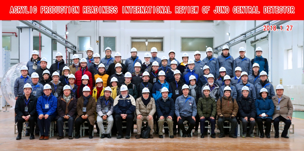 2018年1月27日至28日,江门中微子实验(JUNO)中心探测器有机玻璃球生产国际评审会在泰兴召开。12位来自加拿大、美国、意大利、中国台北及国内的物理、探测器、有机化学、材料力学领域的专家学者组成专家组参加了评审。中共泰兴市委副书记张坤、JUNO项目经理王贻芳、有机玻璃球生产制造厂家汤臣新材料公司董事长汤月生、JUNO项目监理、JUNO指挥部与合作组EB部分成员、中心探测器项目组人员及厂家管理技术人员等共80余人参加了此次会议。泰兴市委副书记张坤致欢迎辞,他希望汤臣把参与国家重点实验的核心部件的制造,作为企业创新发展的一次重大考验和展示企业综合实力的良好机会,全力投入完成制造任务。