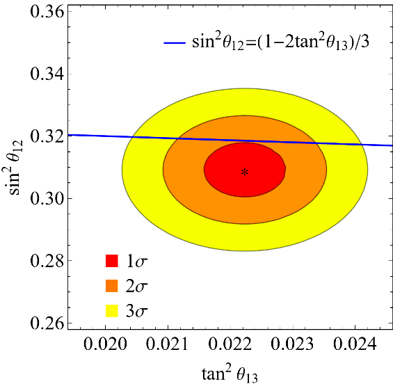置信区间内得到大亚湾和江门实验直接测量结果的支持。可以预期,江门实验结果未来会随着数据统计量的增长而有所涨落且变得更加精确,而理论上量子修正等味对称性破缺效应也会使得