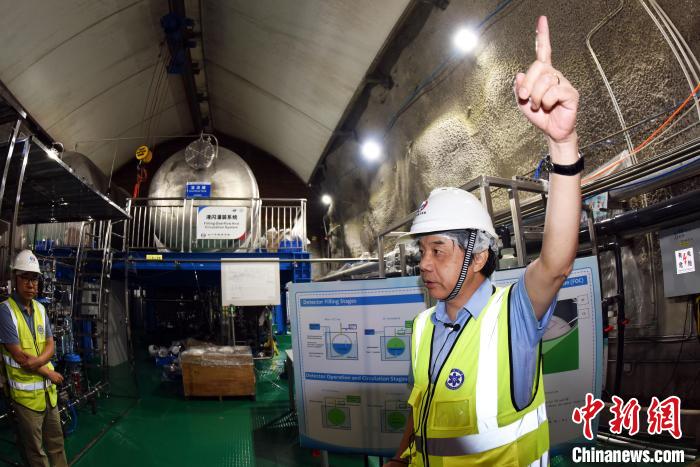 10月10日,王贻芳院士在隧道内介绍地下700米的江门中微子实验建设相关情况。中新网记者 孙自法 摄 王贻芳表示,针对系列国际技术难题,江门中微子实验团队集智攻关,在新型光电倍增管及其水下防爆系统、液闪纯化系统、水下电子学、有机玻璃球及不锈钢网架、深埋地下洞室等领域实现多项重要突破。