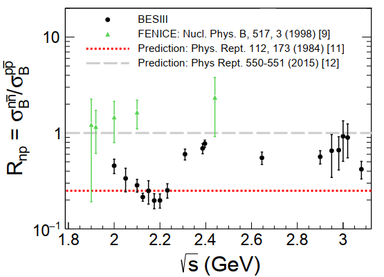 BESIII合作组通过能量扫描方法,在能量区间(质心能量2.0 – 3.08GeV)研究了正负电子对湮灭到中子-反中子对过程。实验团队综合运用中子、反中子在不同子探测器中的信息来有效提高信噪比;还利用100亿J/ψ数据对中子、反中子在探测器中的探测效率、触发效率做精确校准。从而,获得了目前为止中子电磁形状因子最精确的测量结果,与FENICE实验结果相比,平均测量精度提高了约30倍。结合BESIII合作组先前获得的质子研究结果,得到了光子-质子(中子)相互作用截面之比,如图1所示。该结果清楚地表明光子与质子耦合更强。