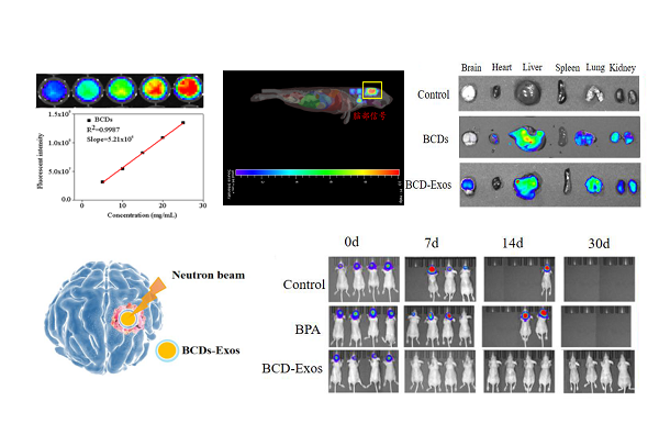 脑胶质瘤是恶性程度高,死亡率高,复发率高的“三高”肿瘤类型,位列我国癌症死亡前十位。由于中子射线的优越穿透能力,无创的硼中子俘获治疗(Boron Neutron Capture Therapy, BNCT)脑胶质瘤显示出巨大的优势。BNCT对脑胶质瘤治疗效果依赖于靶向肿瘤组织的足够的硼-10 (10B)药物,以匹配热中子在适当的时间的精确剂量照射,充分杀死肿瘤组织。为此,邢更妹研究员课题组构建了靶向肿瘤的可视化的新型10B药物——外泌体Exosome修饰的含硼碳点(BCDs),对肿瘤具有高选择性和很好的穿过血脑屏障能力,并能够在肿瘤部位的高蓄积。该药物配合单次中子照射,显示了良好的治疗效果,模型荷瘤小鼠存活率显著延长。