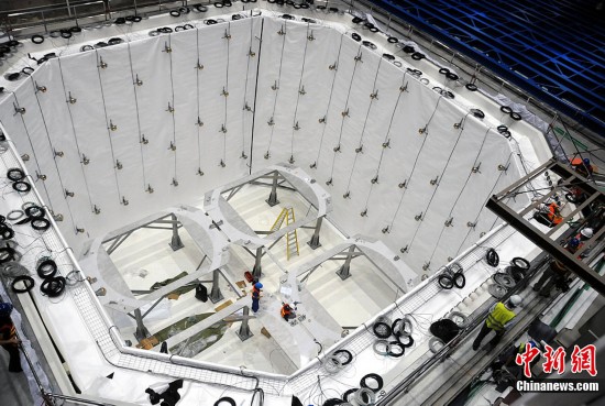 10月21日,中科院大亚湾反应堆中微子实验站,科研人员正在实验大厅内检查中微子探测器的安装支架。位于广东大亚湾核电站内的实验装置经过历时4年的建造,在地下100米深、距反应堆仅360米的近点实验大厅内,安装就位的两个中微子探测器今年8月已经探测到来自核电站反应堆群的中微子。中新社发孙自法 摄