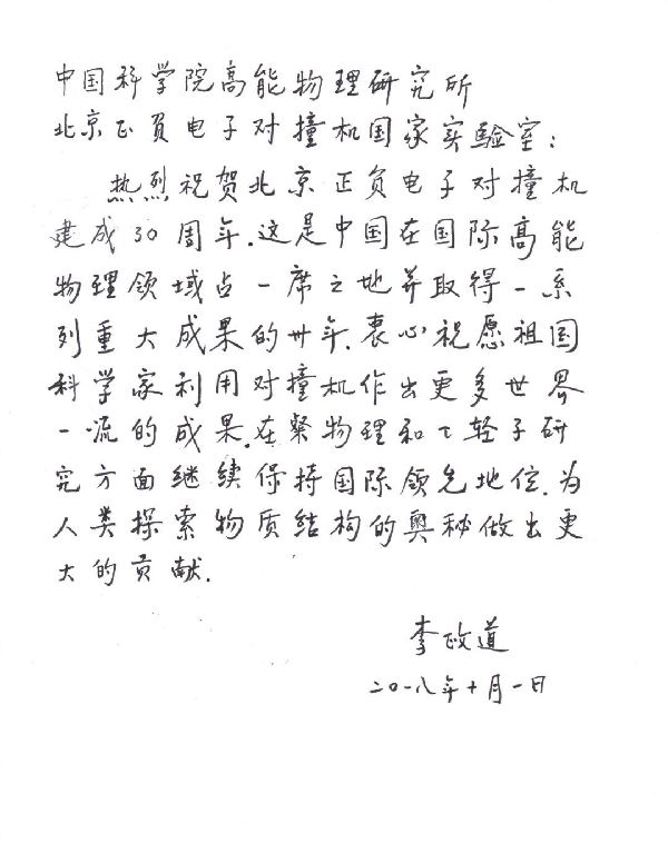 李政道先生为北京正负电子对撞机三十周年发来贺信(高能物理所供图)