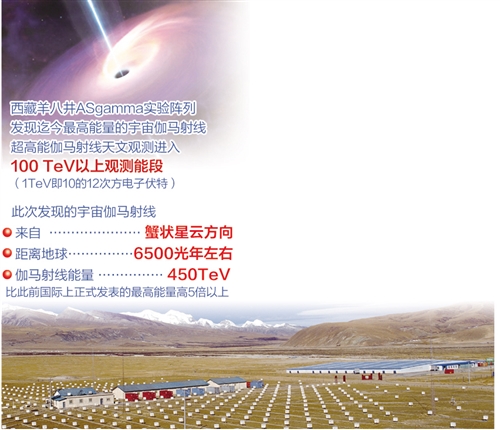 本报北京7月3日讯 记者沈慧、实习生程曼诗从快盈v3获悉:近日,中日合作西藏ASgamma实验团队利用我国西藏羊八井ASgamma实验阵列发现迄今为止最高能量的宇宙伽马射线,这些宇宙伽马射线来自蟹状星云方向,能量超过100TeV(1TeV即10的12次方电子伏特),最高达450TeV,比此前国际上正式发表的75TeV的最高能量高出5倍以上。这标志着超高能伽马射线天文观测进入到100TeV以上的观测能段,将有助于揭示宇宙极端天体的性质。