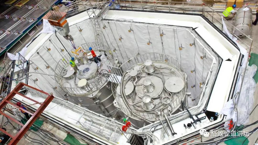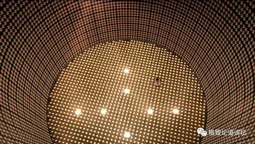 然后里面有一个有机玻璃球,灌两万吨的液体闪烁体,周围有四万个光电倍增管来探测中微子振荡。