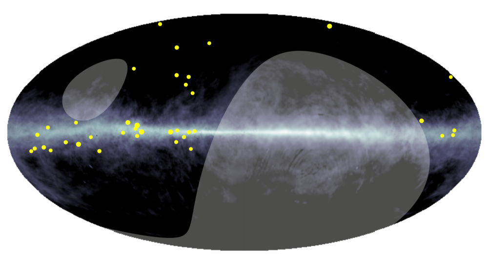 西藏ASγ实验团队观测到的超高能弥散伽马射线事例在银道坐标系下的分布。这些超高能弥散伽马射线的能量在 400 TeV到 1 PeV 之间,表现出向银盘(图中水平中线)集中分布的特点。灰色阴影区域是ASγ实验无法观测的区域。背景色轮廓显示了银河系坐标中氢原子的分布。