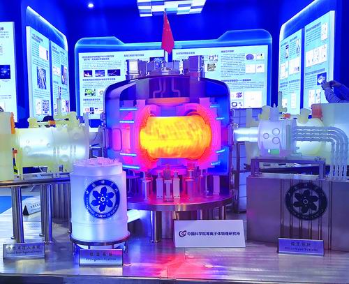 国家“十三五”科技创新成就展上,印着蓝白色中国科学院院徽的中国全超导托卡马克东方超环模型。倪思洁摄