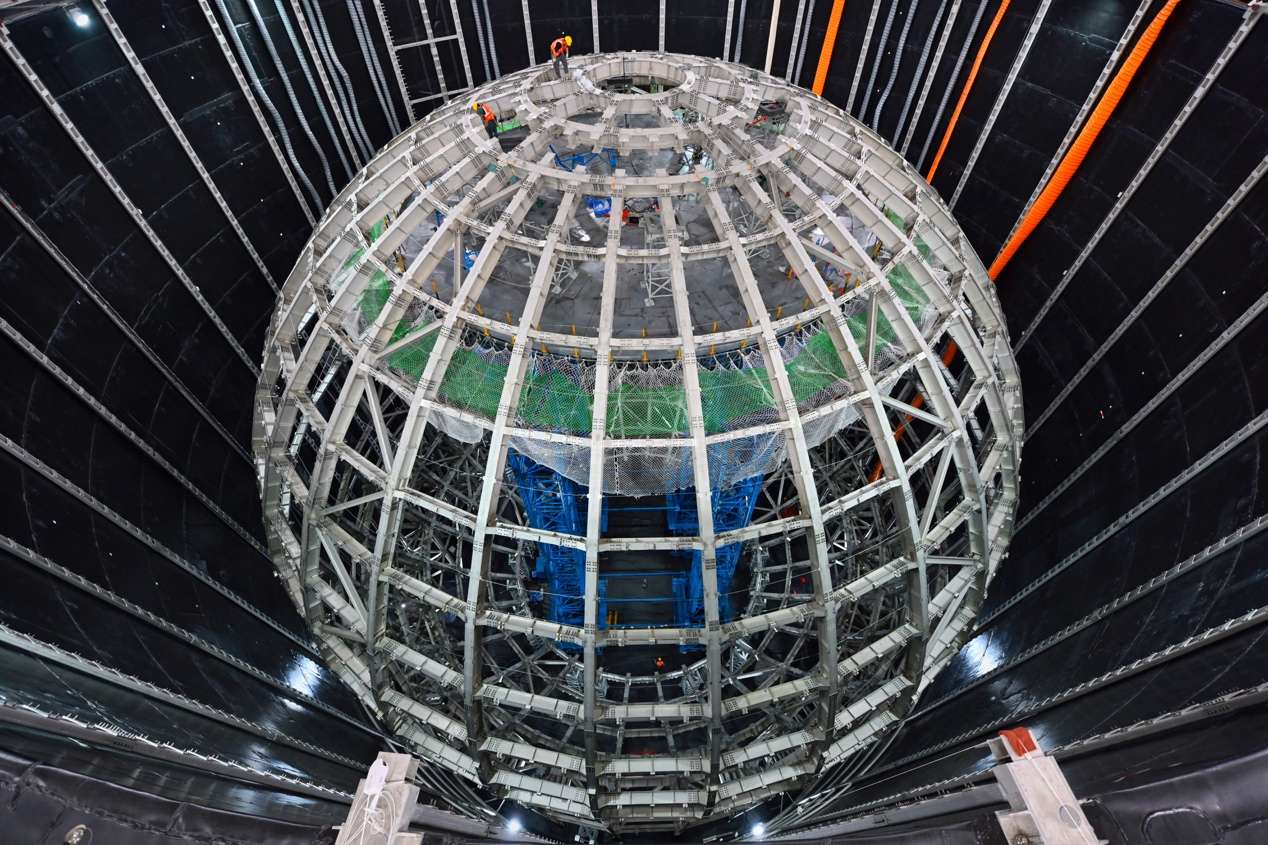 主结构安装完成后,将开始安装中心探测器结构中的有机玻璃球。据介绍,这一有机玻璃球直径为35.4米,壁厚120毫米,重600多吨,是世界上最大的单体有机玻璃结构,生产和建造在国内外都无先例。