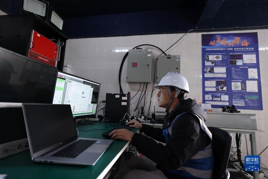 4月22日,工作人员在高海拔宇宙线观测站观测基地水切伦科夫探测器阵列处理实验数据。新华社记者 金立旺 摄