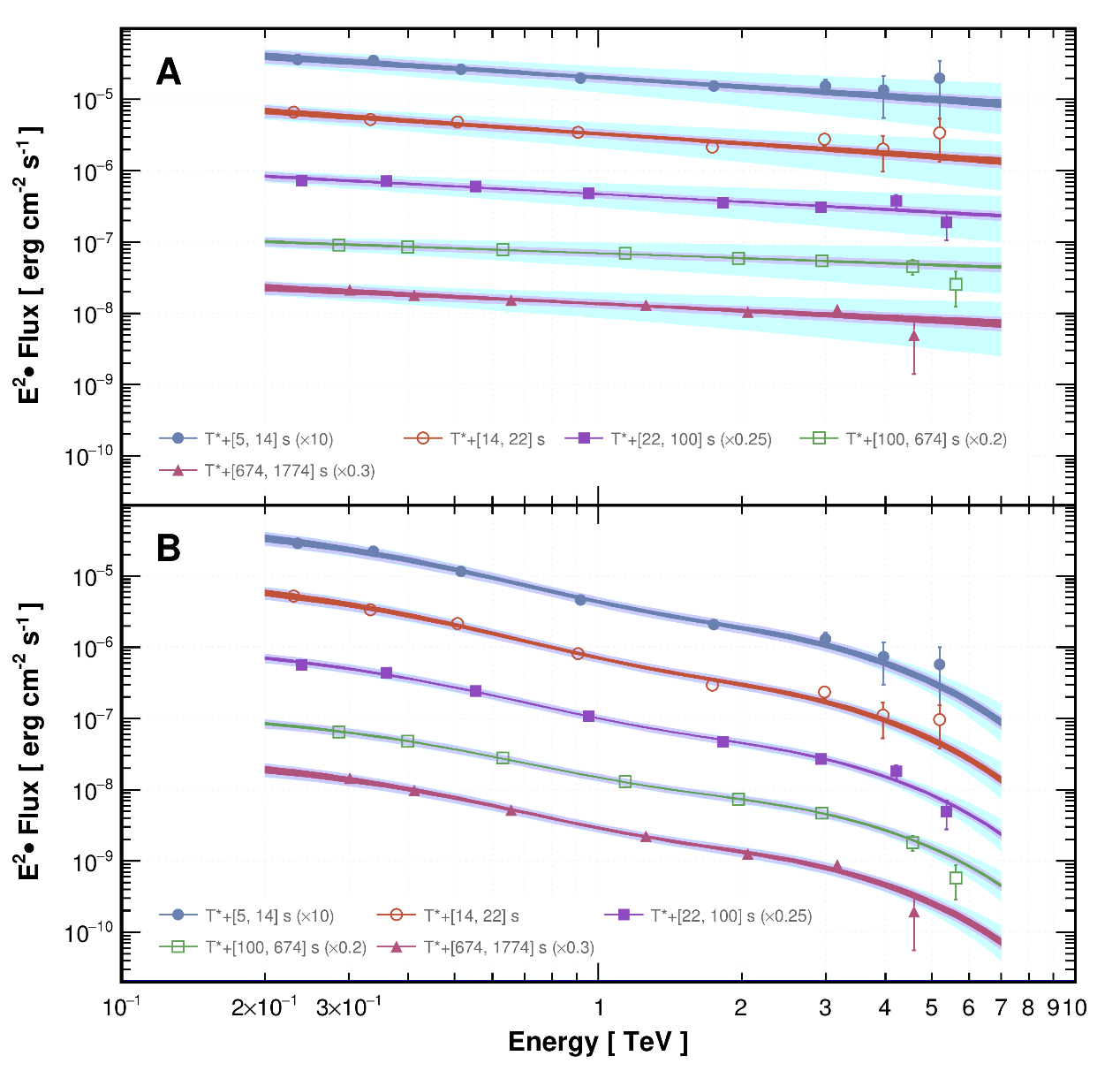 “拉索”测量得到的伽马射线暴221009A在5个时间段的本征谱与观测谱,能量范围约在2千亿到7万亿电子伏特之间。