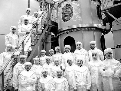 北京谱仪Ⅲ的子探测器——漂移室建造完成后,参研人员合影留念。资料图片