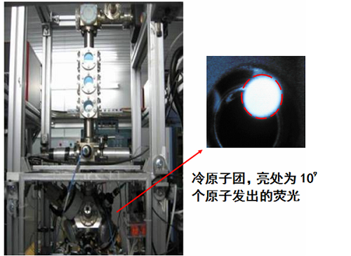 图6 进行冷原子实验的真空落塔装置以及被磁光阱技术囚禁的冷原子团