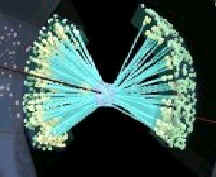中微子质量,以及其他所有轻子和夸克的来源,被认为是由因黑格斯玻色子传递的“黑格斯场”引起的独特相互作用。这个玻色子是费米实验室TeV能级加速器大力寻找的目标。如果找不到,可能会在CERN的LHC上找到。(右图为黑格斯玻色子事例的计算机模拟)