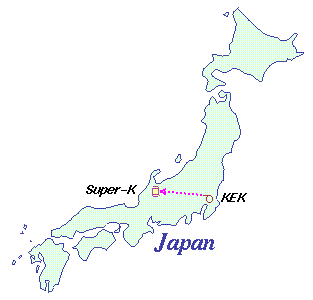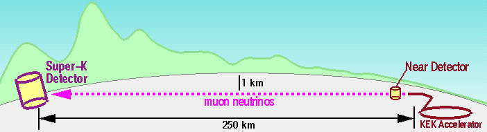 K2K中微子束流是由KEK的12 GeV质子加速器提供的。这些人为形成的中微子几乎全是谬子-中微子,这点已被KEK近探测器的数据所证实。KEK近探测器在中微子产生后和中微子振荡效应可以见到之前,测量中微子束流的亮度和能谱。 束流被引向距KEK250公里远的超级神冈探测器。中微子束流的能谱类似大气中微子的能谱,长基线实验可以使我们检验在大气中微子中观测到的中微子振荡效应。(左图为 K2K实验说明。高纯度谬子中微子束流在约1 GeV时有很广的能谱,由KEK的加速器产生,通过地下引到250公里远的超级神冈。)