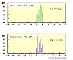 二、所观测到的中微子谱显示的正好是中微子振荡效应期待的畸变类型。 (右图说明了在超级神冈鉴别KEK束流感应事例的方法。图中显示在超级神冈和KEK分别在微秒时间内从GPS观测到的事例时间和期望束流到达时间之间的差别。在显示的时间窗口中,产生大气中微子背景事例有一个可忽略的概率,最近的这样事例超过120微秒)