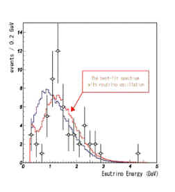 K2K实验利用KEK的近探测器(左图)测量中微子束流的流强和能谱,然后测量在超级神冈的远探测器的任何差别。通亮的差别或能谱畸变提供中微子振荡的证据。自1998年开始取数据以来,数据分析不断得到改进,对探测器系统的了解不断加强。到2004年5月分析所有数据获得的结果如下: