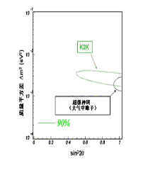 右上图是新的K2K结果(绿色),2种(m-t)中微子振荡参数(质量平方差和混合参数)有90%可信度的圈区与超级神冈大气中微子(黑色)结果的比较。)