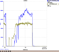 美国杰斐逊国家实验室传来最新消息,由该实验室研制的10千瓦级自由电子激光器2003年6月17日首次出光,经过一年的努力,2004年6月底在 6微米波长连续波运行时获得8.5 千瓦功率,加速器运行的能量为145 MeV,流强5 mA,(下图为自由电子激光器的输出功率和试验中的加速器电流,注意高功率时的延长时间)接近了10千瓦的设计指标。