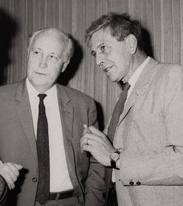 六、1965年,时任西欧中心理论研究部主任的L.VAN HOVE访问日本时,日本名古屋大学的S.SAKATA教授找到他,希望西欧中心与中国物理学家建立联系。杨振宁教授约在同一时间也提出类似的建议。此事与当时任总所长的WEISSKOPF进行了讨论,结果,在GREGORY(Professor Bernard Gregory)(下图右)在1966年1月担任西欧中心总所长后最先作的事情之一,就是发信给在中科院核研究所工作的周光召和钱三强。该信于1966年1月17日签发。在解释过西欧中心的目的后,GREGORY希望两位科学家在促进中国和西欧中心的科学联系中予以帮助和支持。该信未收到回音。