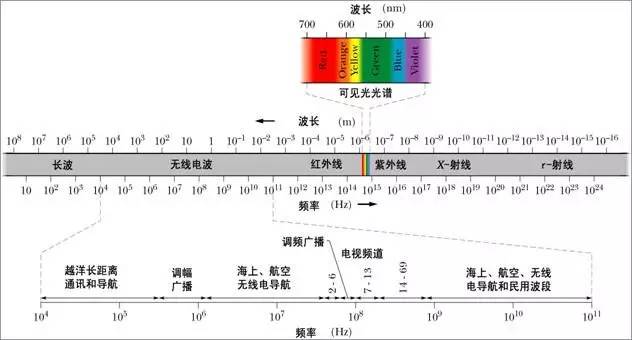 电磁辐射在我们的生活周围很常见,电磁辐射即电磁能量以电磁波形式或者光量子形式发射或泄漏到空间的现象。它的传播速度即为人们通常所说的光速。举例说,正在发射讯号的射频天线,基站就会向四周辐射电磁波。电磁辐射根据频率或波长分为不同类型,如图1所示的电磁波谱。这些类型包括(按序增加频率):无线电波、微波、红外线、可见光、紫外线、X射线及γ射线。从图中我们可以看到,波长最短的伽马射线仅为千分之一纳米,而最长的无线电波波长长达数十米,医院里CT机的X射线波长在1纳米左右。用来杀菌消毒的紫外线比可见光波长短,烤箱产生的用来加热食物红外线的波长则比可见光波长长,此外还有微波炉产生的波长为厘米量级,而收音机接受的短波波长为米量级。