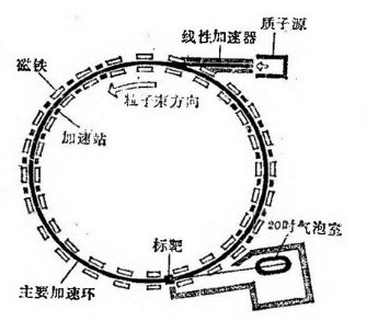 物理学家在探索微观世界时,经常采用的一种方法是把一束已知性质的基本粒子作为炮弹,去轰击所要研究的某种未知的基本粒子,通过观察它们之间的相互作用,来研究靶粒子的性质。在研究基本粒子的时候,为了看清它的结构,作为炮弹的基本粒子的波长,应该越短越好,或者是它们的动量越大越好;否则,由于波动的强烈干扰,很难对靶粒子作出精确的测量。可是,粒子朿的能量越大,它们就越难驯服,就是要它们转个弯也很不简单。解决的办法,只能把加速器的“跑道”弯曲的程度尽量减小,这样加速器的直径也就越来越大了。