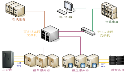 计算中心采用“磁盘-磁带”的分级存储技术以及基于万兆以太网的网络存储技术来建设海量存储数据中心。数据分级存储将不经常访问的数据自动移到存储层次中较低的层次,释放出较高成本的存储空间给更频繁访问的数据。网络存储是21世纪初存储技术的一个变革,它将存储设备与服务器分离,组建专门的存储网络,使得存储系统具有更好的可共享性、可扩展性、高可靠性以及更好的性能。
