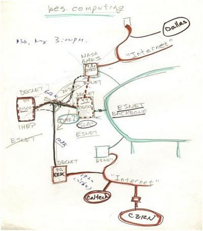 图1 当年中美两国科学家1991年草拟的IHEP-SLAC联网设计图。